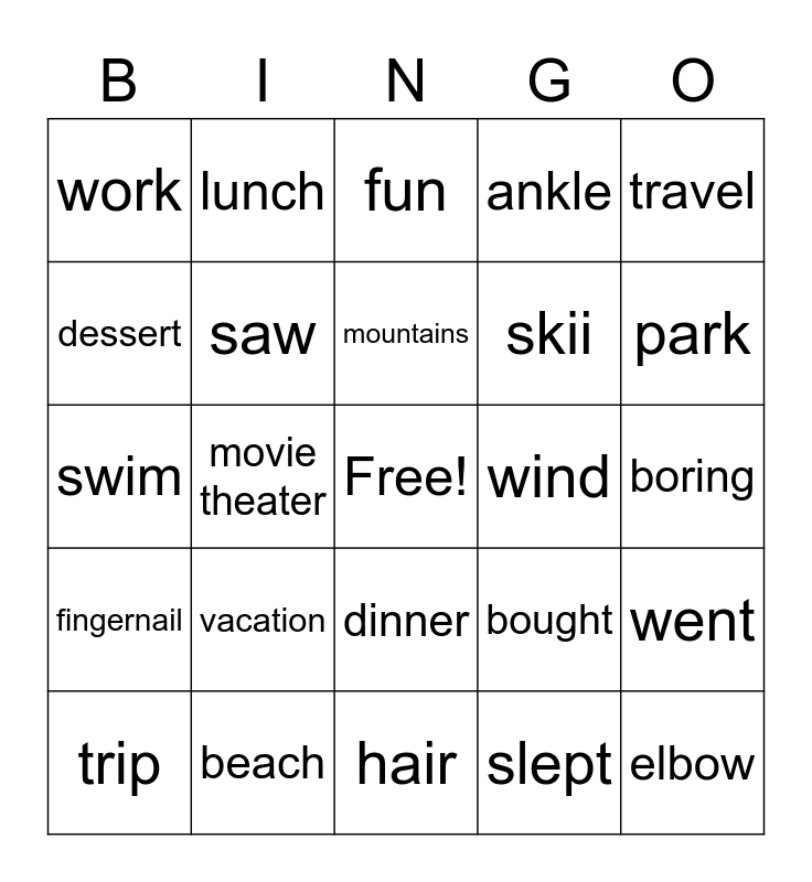 This bingo card has a free space and 24 words: vacation, beach, mountains, trip, travel, work, dessert, lunch, wind, dinner, skii, swim, bought, went, saw, slept, boring, fun, park, movie theater, elbow, fingernail, ankle and hair.