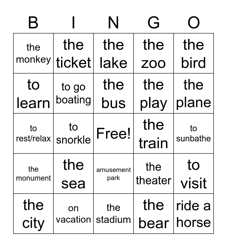 This bingo card has a free space and 24 words: the sea, on vacation, the bus, the city, the bird, the monkey, to learn, the ticket, the train, amusement park, the play, to rest/relax, the theater, to visit, to go boating, the bear, to sunbathe, the lake, the plane, to snorkle, ride a horse, the monument, the zoo and the stadium.