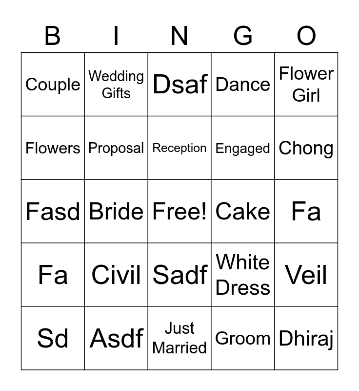 This bingo card has a free space and 50 words: Dhanishta, Dhiraj, Invitations, Just Married, Civil, Jewelry, Wedding Gifts, Ring, Flowers, Bouquet, Proposal, Dance, Veil, White Dress, Toast, Champagne, Reception, Cake, Tuxedo, Flower Girl, Bride, Groom, Couple, Engaged, I Do, Ching, Chong, Adfa, Dsaf, Sadf, Asdf, Asdfa, Sdf, Asdf, Asdf, Asd, Fa, Sdf, Asd, Fa, Sdf, A, Sdf, A, Sd, Fasd, F, Asd, Fa and Asdfasdf.