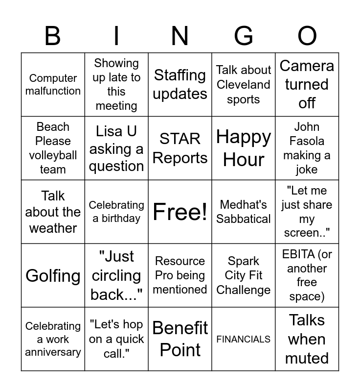 This bingo card has a free space and 24 words: "Just circling back...", "Let's hop on a quick call.", STAR Reports, Celebrating a work anniversary, Camera turned off, Computer malfunction, Beach Please volleyball team, Showing up late to this meeting, Medhat's Sabbatical, Resource Pro being mentioned, Happy Hour, Talk about the weather, Spark City Fit Challenge, EBITA (or another free space), Lisa U asking a question, FINANCIALS, "Let me just share my screen..", Staffing updates, John Fasola making a joke, Celebrating a birthday, Talks when muted, Golfing, Talk about Cleveland sports and Benefit Point.