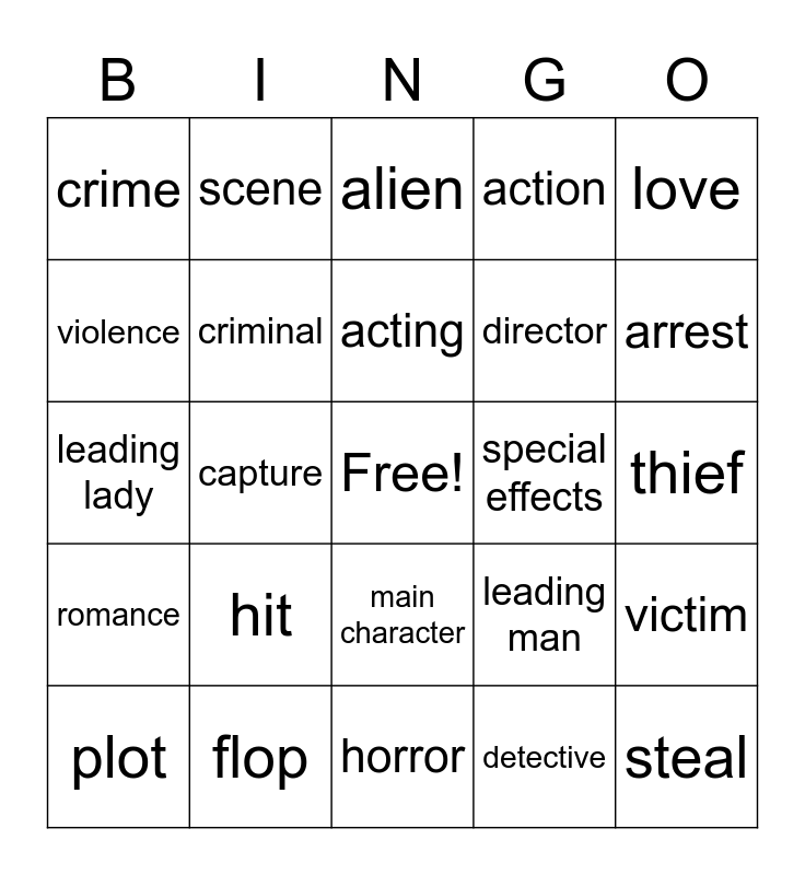 This bingo card has a free space and 24 words: hit, flop, acting, plot, love, crime, violence, scene, special effects, main character, director, leading lady, leading man, victim, criminal, detective, thief, alien, arrest, capture, steal, romance, action and horror.