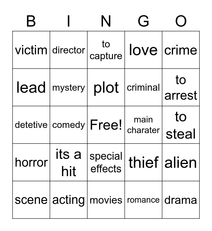 This bingo card has a free space and 24 words: its a hit, acting, plot, scene, crime, victim, lead, director, main charater, special effects, criminal, detetive, thief, alien, mystery, romance, to steal, to capture, to arrest, comedy, drama, horror, love and movies.