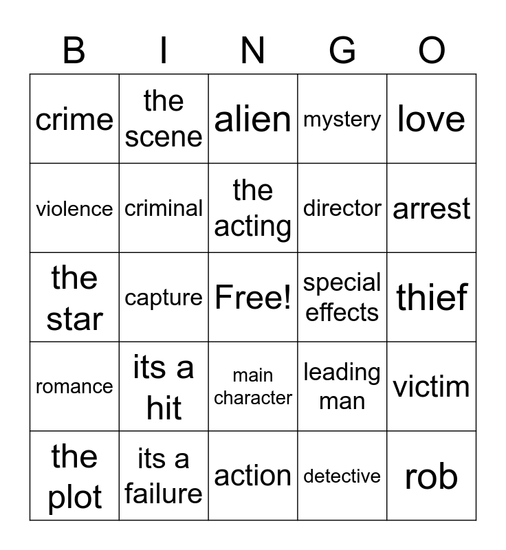 This bingo card has a free space and 24 words: its a hit, its a failure, the acting, the plot, love, crime, violence, the scene, special effects, main character, director, the star, leading man, victim, criminal, detective, thief, alien, arrest, capture, rob, romance, mystery and action.