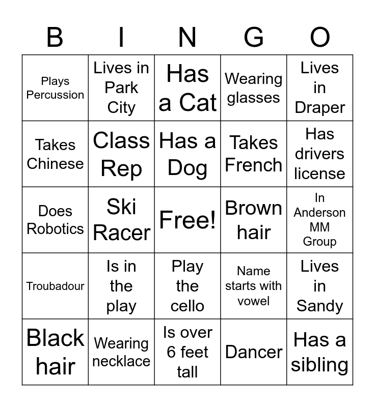 This bingo card has a free space and 32 words: Dancer, Lax Player, Ski Racer, Soccer Player, Troubadour, Class Rep, Lives in Draper, Lives in Sandy, Lives in Park City, Lives in Holladay, Has a Dog, Has a Cat, Is NOT in uniform, White Sneakers on, Brown hair, Blond hair, Black hair, Does Robotics, Play the cello, Is in the play, Name starts with vowel, In Brennan MM Group, In Anderson MM Group, Wearing necklace, Has a sibling, Wearing glasses, Takes French, Takes Chinese, Plays Percussion, Is over 6 feet tall, Does debate and Has drivers license.