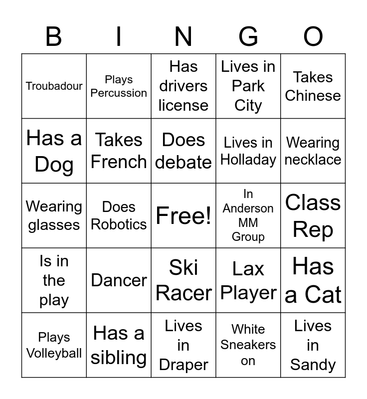 This bingo card has a free space and 33 words: Blond hair, Black hair, Does Robotics, Play the cello, Is in the play, Takes French, Takes Chinese, Plays Volleyball, Plays Percussion, Is over 6 feet tall, Does debate, Has drivers license, Name starts with vowel, In Brennan MM Group, In Anderson MM Group, Wearing necklace, Has a sibling, Wearing glasses, Dancer, Lax Player, Ski Racer, Soccer Player, Troubadour, Class Rep, Lives in Draper, Lives in Sandy, Lives in Park City, Lives in Holladay, Has a Dog, Has a Cat, Is NOT in uniform, White Sneakers on and Brown hair.