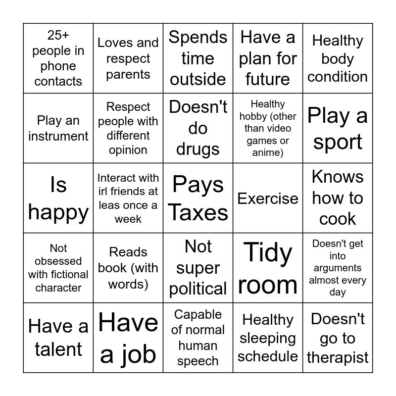 This bingo card has a free space and 24 words: Reads book (with words), Have a job, Doesn't do drugs, Have a talent, Healthy body condition, 25+ people in phone contacts, Play an instrument, Loves and respect parents, Exercise, Not super political, Healthy hobby (other than video games or anime), Is happy, Tidy room, Doesn't get into arguments almost every day, Respect people with different opinion, Healthy sleeping schedule, Knows how to cook, Spends time outside, Play a sport, Interact with irl friends at leas once a week, Doesn't go to therapist, Not obsessed with fictional character, Have a plan for future and Capable of normal human speech.
