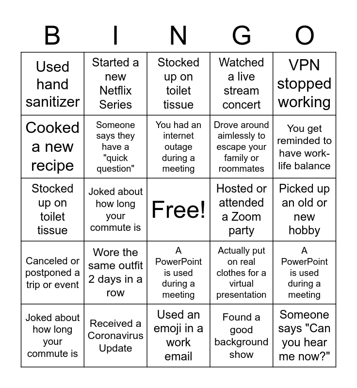 This bingo card has a free space and 195 words: Forgot to take yourself off mute, Canceled or postponed a trip or event, Set a goal weight to fit back into your work clothes, Talked out loud to yourself, Actually saw a coworker in person, Did chores on a lunch break, Spotted/heard a pet or child in the background of a meeting, Homeschooled or babysat your kids or someone else's kids during the workday, Someone says "Can you hear me now?", Drove around aimlessly to escape your family or roommates, Picked up an old or new hobby, Did some chair yoga, A PowerPoint is used during a meeting, You get reminded to have work-life balance, Someone says they miss the office, Actually put on real clothes for a virtual presentation, Found a good background show, Used an emoji in a work email, Joked about how long your commute is, Used an odd area as your work station, Video Chatted with Friends/Family, Cooked a new recipe, Forgot to mute yourself on Zoom, Started a new Netflix Series, Received a Coronavirus Update, Someone says they have a "quick question", You get reminded to have work-life balance, Someone says they miss the office, Actually put on real clothes for a virtual presentation, Found a good background show, Used an emoji in a work email, Joked about how long your commute is, Used an odd area as your work station, Video Chatted with Friends/Family, Cooked a new recipe, Forgot to mute yourself on Zoom, Started a new Netflix Series, Received a Coronavirus Update, Someone says they have a "quick question", Wore the same outfit 2 days in a row, You had to reset your password, Someone says "Sorry, I was on mute", Someone had a full-screen freeze with a funny face, Someone says "Can you see my screen? How about now?", Someone says "Mute your lines please", Hosted or attended a Zoom party, Used hand sanitizer, Had to walk back to your car because you forgot a face mask, Cleaned out a junk drawer, VPN stopped working, Watched a live stream concert, Stocked up on toilet tissue, Actually saw a coworker in person, Did chores on a lunch break, Spotted/heard a pet or child in the background of a meeting, Homeschooled or babysat your kids or someone else's kids during the workday, You had an internet outage during a meeting, Someone says "Can you hear me now?", Drove around aimlessly to escape your family or roommates, Picked up an old or new hobby, Did some chair yoga, A PowerPoint is used during a meeting, You get reminded to have work-life balance, Someone says they miss the office, Actually put on real clothes for a virtual presentation, Found a good background show, Used an emoji in a work email, Joked about how long your commute is, Used an odd area as your work station, Video Chatted with Friends/Family, Cooked a new recipe, Forgot to mute yourself on Zoom, Started a new Netflix Series, Received a Coronavirus Update, Someone says they have a "quick question", Wore the same outfit 2 days in a row, Canceled or postponed a trip or event, Set a goal weight to fit back into your work clothes, Talked out loud to yourself, Stocked up on toilet tissue, Actually saw a coworker in person, Did chores on a lunch break, Spotted/heard a pet or child in the background of a meeting, Homeschooled or babysat your kids or someone else's kids during the workday, You had an internet outage during a meeting, Someone says "Can you hear me now?", Drove around aimlessly to escape your family or roommates, Picked up an old or new hobby, Did some chair yoga, A PowerPoint is used during a meeting, You get reminded to have work-life balance, Someone says they miss the office, Actually put on real clothes for a virtual presentation, Found a good background show, Used an emoji in a work email, Joked about how long your commute is, Used an odd area as your work station, Video Chatted with Friends/Family, Cooked a new recipe, Forgot to mute yourself on Zoom, Started a new Netflix Series, You had an internet outage during a meeting, Someone says "Can you hear me now?", Drove around aimlessly to escape your family or roommates, Picked up an old or new hobby, Did some chair yoga, A PowerPoint is used during a meeting, You get reminded to have work-life balance, Someone says they miss the office, Actually put on real clothes for a virtual presentation, Found a good background show, Used an emoji in a work email, Joked about how long your commute is, Used an odd area as your work station, Video Chatted with Friends/Family, Cooked a new recipe, Forgot to mute yourself on Zoom, Started a new Netflix Series, Received a Coronavirus Update, Someone says they have a "quick question", Wore the same outfit 2 days in a row, You had to reset your password, Someone says "Sorry, I was on mute", Someone had a full screen freeze with a funny face, Someone says "Can you see my screen? How about now?", Someone says "Mute your lines please", Hosted or attended a Zoom party, Used hand sanitizer, Had to walk back to your car because you forgot a face mask, Cleaned out a junk drawer, You had an internet outage during a meeting, Someone says "Can you hear me now?", Drove around aimlessly to escape your family or roommates, Picked up an old or new hobby, Did some chair yoga, A PowerPoint is used during a meeting, You get reminded to have work-life balance, Someone says they miss the office, Actually put on real clothes for a virtual presentation, Found a good background show, Used an emoji in a work email, Joked about how long your commute is, Used an odd area as your work station, Video Chatted with Friends/Family, Cooked a new recipe, Forgot to mute yourself on Zoom, Started a new Netflix Series, Received a Coronavirus Update, Someone says they have a "quick question", Wore the same outfit 2 days in a row, You had to reset your password, Someone says "Sorry, I was on mute", Someone had a full screen freeze with a funny face, Someone says "Can you see my screen? How about now?", Someone says "Mute your lines please", Hosted or attended a Zoom party, Used