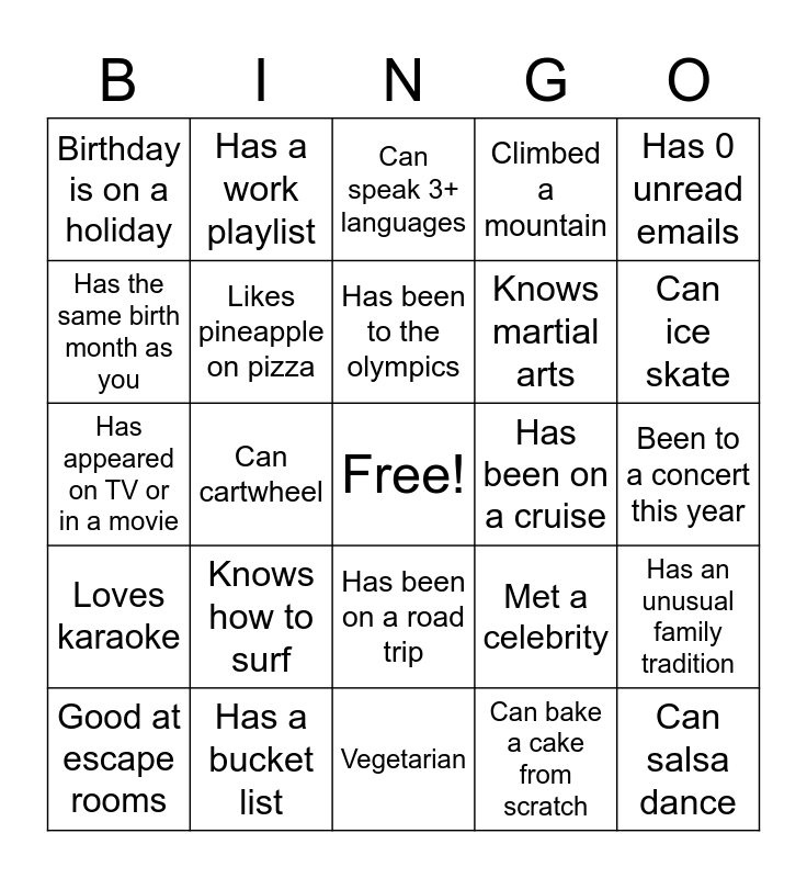 This bingo card has a free space and 25 words: Knows how to surf, Vegetarian, Has been to the olympics, Good at escape rooms, Has 0 unread emails, Birthday is on a holiday, Has the same birth month as you, Has a work playlist, Has been on a cruise, Has been on a road trip, Knows martial arts, Has appeared on TV or in a movie, Met a celebrity, Has an unusual family tradition, Likes pineapple on pizza, Has been skydiving, Been to a concert this year, Can speak 3+ languages, Can ice skate, Can cartwheel, Can salsa dance, Has a bucket list, Loves karaoke, Climbed a mountain and Can bake a cake from scratch.