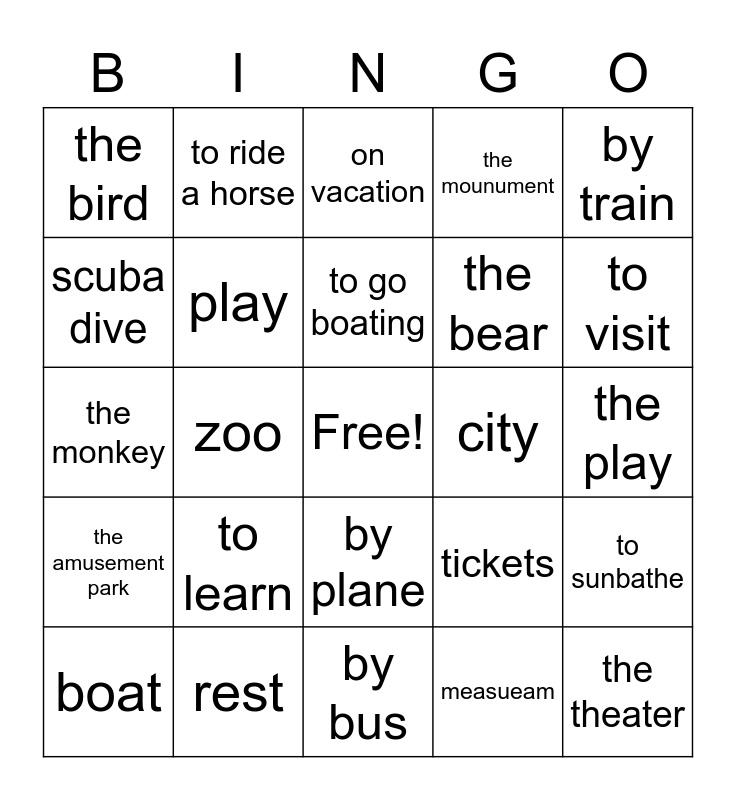 This bingo card has a free space and 24 words: to learn, rest, to go boating, boat, by train, the bird, scuba dive, to ride a horse, city, by plane, the bear, the monkey, tickets, to sunbathe, play, measueam, the play, on vacation, to visit, zoo, the theater, the amusement park, the mounument and by bus.