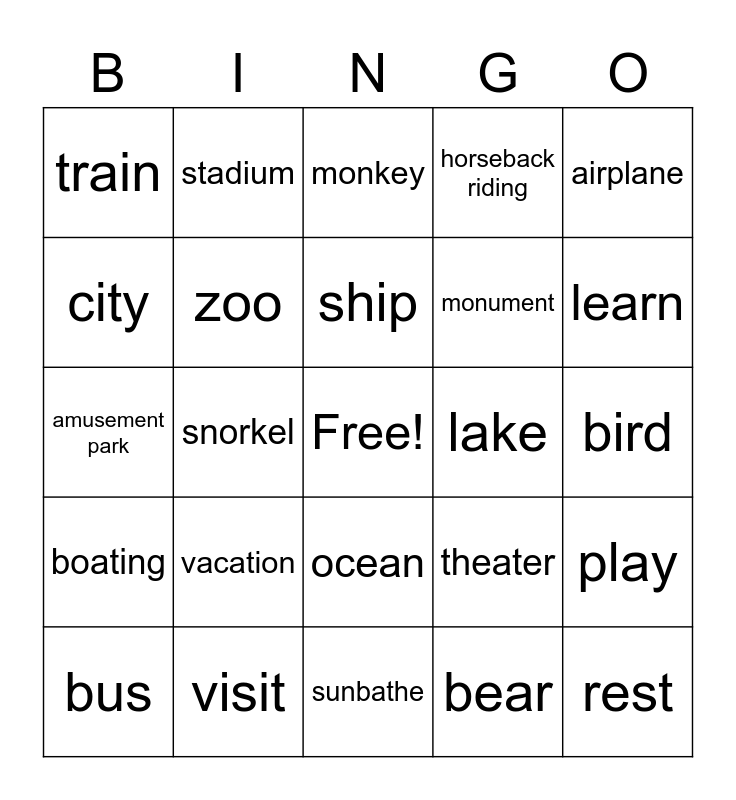 This bingo card has a free space and 24 words: vacation, visit, ship, bus, airplane, train, city, stadium, lake, ocean, monument, amusement park, theater, play, zoo, bear, bird, monkey, learn, snorkel, rest, boating, horseback riding and sunbathe.