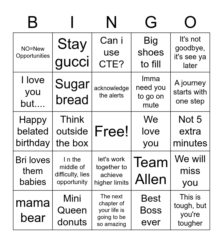 This bingo card has a free space and 24 words: I n the middle of difficulty, lies opportunity, Mini Queen donuts, acknowledge the alerts, mama bear, It's not goodbye, it's see ya later, NO=New Opportunities, I love you but...., Stay gucci, We love you, let's work together to achieve higher limits, Imma need you to go on mute, Happy belated birthday, Team Allen, We will miss you, Sugar bread, Best Boss ever, Not 5 extra minutes, Can i use CTE?, A journey starts with one step, Think outside the box, This is tough, but you're tougher, Bri loves them babies, Big shoes to fill and The next chapter of your life is going to be so amazing.
