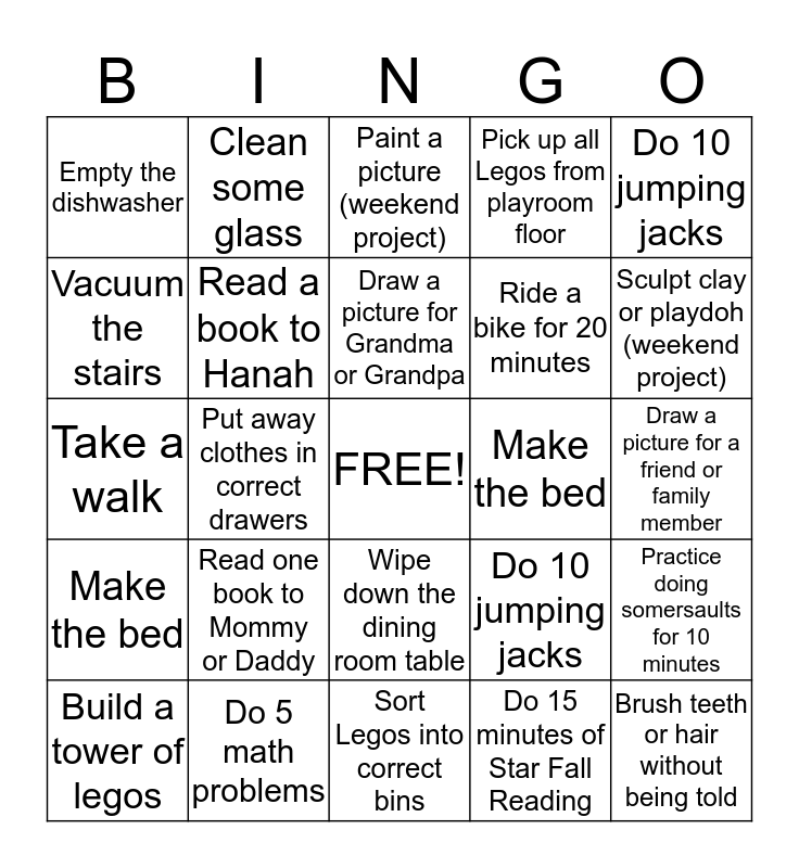 This bingo card has a free space and 24 words: Read one book to Mommy or Daddy, Do 5 math problems, Draw a picture for Grandma or Grandpa, Build a tower of legos, Do 10 jumping jacks, Empty the dishwasher, Vacuum the stairs, Clean some glass, Make the bed, Wipe down the dining room table, Ride a bike for 20 minutes, Take a walk, Do 10 jumping jacks, Practice doing somersaults for 10 minutes, Read a book to Hanah, Do 15 minutes of Star Fall Reading, Draw a picture for a friend or family member, Paint a picture (weekend project), Sculpt clay or playdoh (weekend project), Put away clothes in correct drawers, Brush teeth or hair without being told, Make the bed, Pick up all Legos from playroom floor and Sort Legos into correct bins.