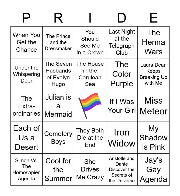 This bingo card has a free space and 45 words: Pumpkin, Jay's Gay Agenda, Felix Ever After, Simon Vs. The Homosapien Agenda, All Boys Aren't Blue, Aristotle and Dante Discover the Secrets of the Universe, You Should See Me In a Crown, Prince and Knight, The Henna Wars, Cool for the Summer, Last Night at the Telegraph Club, If I Was Your Girl, They Both Die at the End, Cemetery Boys, Heart- stoppers, She Drives Me Crazy, These Witches Don't Burn, The Extra-ordinaries, The Love and Lies of Rukhsana Ali, Laura Dean Keeps Breaking Up with Me, The Prince and the Dressmaker, Little and Lion, Melissa, When You Get the Chance, The Witch King, Miss Meteor, Dread Nation, Drama, Iron Widow, Each of Us a Desert, The Miseducation of Cameron Post, My Shadow is Pink, And Tango Makes Three, A Day in the Life of Marlon Bundo, I Am Jazz, Julian is a Mermaid, When Aidan Became a Big Brother, Hurricane Child, Princess Princess Ever After, The House in the Cerulean Sea, Under the Whispering Door, The Color Purple, Red, White, and Royal Blue, The Seven Husbands of Evelyn Hugo and Fun Home.