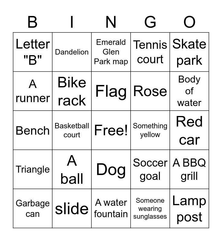 This bingo card has a free space and 25 words: A ball, A water fountain, Flag, Garbage can, Skate park, Letter "B", A runner, Dandelion, Something yellow, Dog, Rose, Bench, Soccer goal, A BBQ grill, Bike rack, Person wearing a hat, Red car, Emerald Glen Park map, Body of water, Basketball court, Lamp post, slide, Triangle, Tennis court and Someone wearing sunglasses.