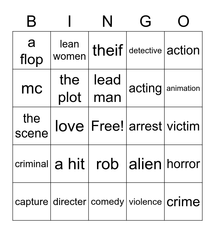 This bingo card has a free space and 24 words: a hit, directer, lead man, capture, action, a flop, mc, lean women, arrest, rob, acting, the scene, alien, horror, the plot, violence, victim, theif, animation, love, crime, criminal, detective and comedy.