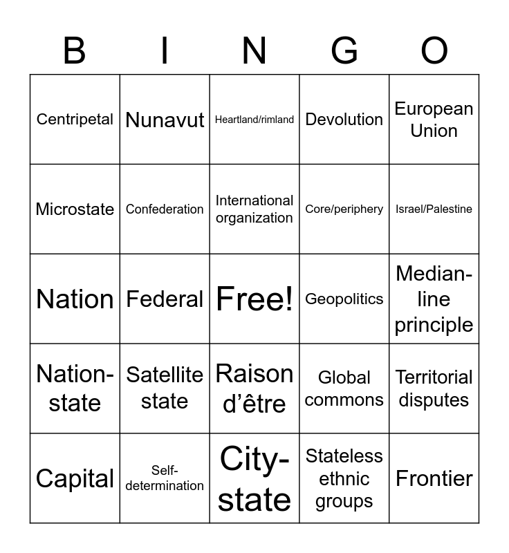This bingo card has a free space and 57 words: Buffer state, Capital, Centrifugal, Centripetal, City-state, Colonialism, Confederation, Conference of Berlin (1884), Core/periphery, Decolonization, Devolution, Domino theory, EEZ (Exclusive Economic Zone), Electoral regions, Enclave/exclave, Ethnic conflict, European Union, Federal, Forward capital, Frontier, Geopolitics, Gerrymander, Global commons, Heartland/rimland, Immigrant states, International organization, Iron Curtain, Irredentism, Israel/Palestine, Landlocked, Law of the Sea, Lebanon, Mackinder, Halford J., Manifest destiny, Median-line principle, Microstate, Ministate, Nation, National iconography, Nation-state, Nunavut, Raison d’être, Reapportionment, Regionalism, Religious conflict, Reunification, Satellite state, Self-determination, Shatterbelt, Sovereignty, State, Stateless ethnic groups, Stateless nation, Suffrage, Supranationalism, Territorial disputes and Territorial morphology.