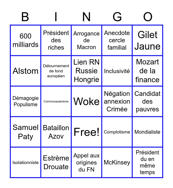 This bingo card has 26 words: Free!, McKinsey, Lien RN Russie Hongrie, Estrème Drouate, Gilet Jaune, 600 milliards, Alstom, Président des riches, Candidat des pauvres, Complotisme, Inclusivité, Démagogie Populisme, Mondialiste, Isolationniste, Communautarisme, Elite mondialiste Rothschild, Anecdote cercle familial, Samuel Paty, Arrogance de Macron, Woke, Mozart de la finance, Appel aux origines du FN, Négation annexion Crimée, Bataillon Azov, Détournement de fond européen and Président du en même temps.