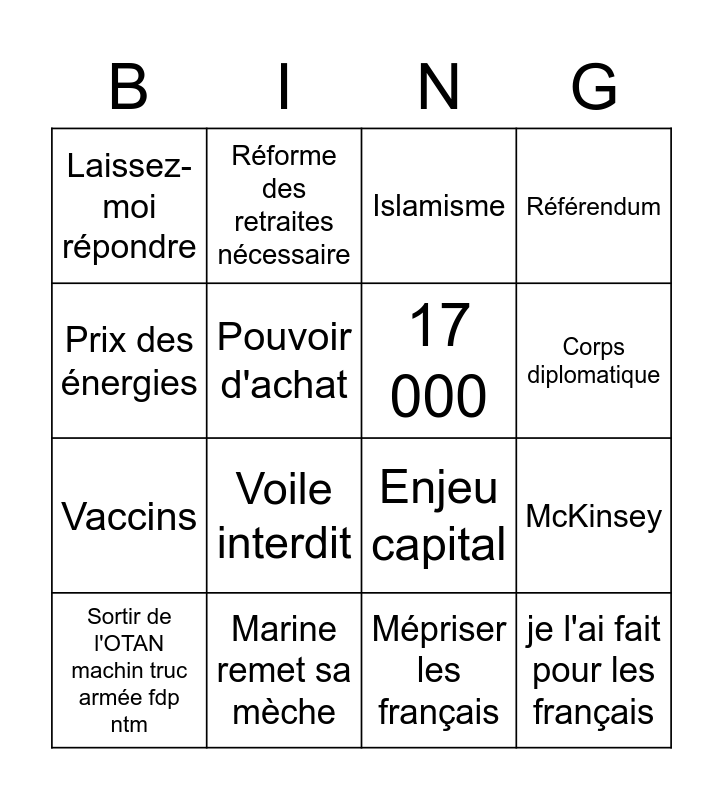 This bingo card has 16 words: Marine remet sa mèche, McKinsey, Islamisme, Laissez-moi répondre, Vaccins, Réforme des retraites nécessaire, Enjeu capital, Mépriser les français, Prix des énergies, Pouvoir d'achat, Sortir de l'OTAN machin truc armée fdp ntm, Référendum, Voile interdit, Corps diplomatique, 17 000 and je l'ai fait pour les français.