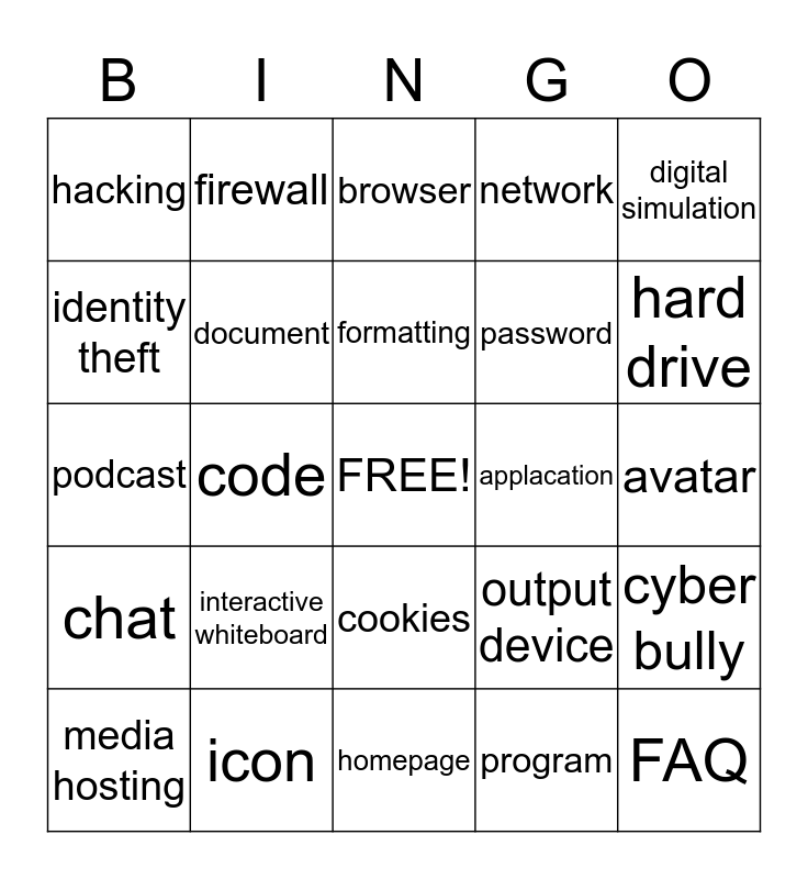 This bingo card has a free space and 24 words: interactive whiteboard, icon, formatting, media hosting, digital simulation, hacking, identity theft, firewall, applacation, cookies, password, podcast, output device, cyber bully, document, program, avatar, browser, hard drive, code, FAQ, chat, network and homepage.