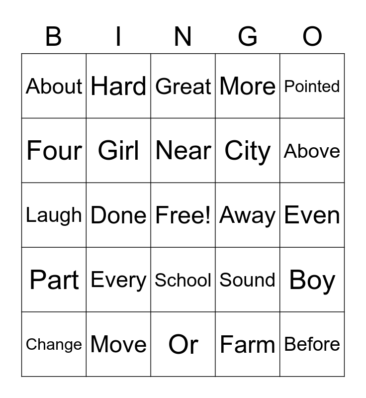 This bingo card has a free space and 28 words: Boy, Car, City, Farm, Four, Great, Hard, Part, Away, Change, Laugh, More, Move, Or, Above, Earth, Every, Girl, Near, School, About, Around, Before, Done, Even, Sound, Pointed and Through.