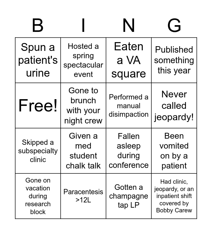 This bingo card has 16 words: Paracentesis >12L, Been vomited on by a patient, Eaten a VA square, Spun a patient's urine, Skipped a subspecialty clinic, Hosted a spring spectacular event, Fallen asleep during conference, Gotten a champagne tap LP, Free!, Gone to brunch with your night crew, Gone on vacation during research block, Published something this year, Given a med student chalk talk, Never called jeopardy!, Performed a manual disimpaction and Had clinic, jeopardy, or an inpatient shift covered by Bobby Carew.