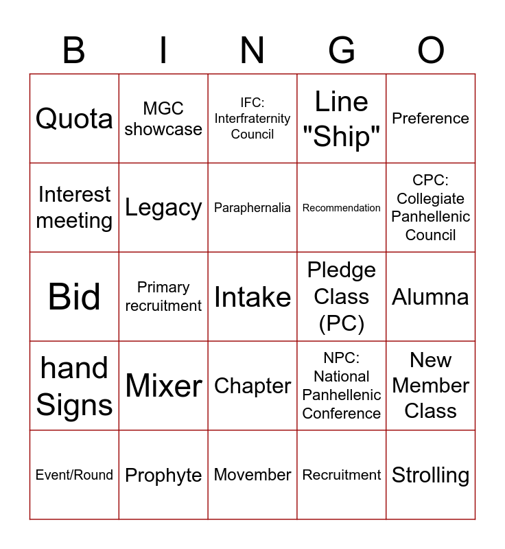 This bingo card has 51 words: Free!, Intake, Membership Selection, Movember, Mixer, MGC: Multicultural Greek Council, MGC showcase, Interest, Interest meeting, Initiation, Legacy, Line "Ship", New Member Class, NPC: National Panhellenic Conference, NPHC: National Pan-Hellenic Council, New Member Presentation, Paraphernalia, Pledge Class (PC), Potential Member (PNM), Preference, Primary recruitment, Recruitment, Quota, Recommendation, Stepping/Step Show, Strolling, CPC: Collegiate Panhellenic Council, Crossing, Event/Round, IFC: Interfraternity Council, Hand Signs, Informational, Neophyte, New/Associate member, Panhellenic Preview, Prophyte, Rho Gamma, Total, Active, Alumni, Alumna, hand Signs, Informational, Intake, Interest, Interest meet, Bid, Bid List, Call/Chant, Chapter and Continuous Open Bidding (COB).