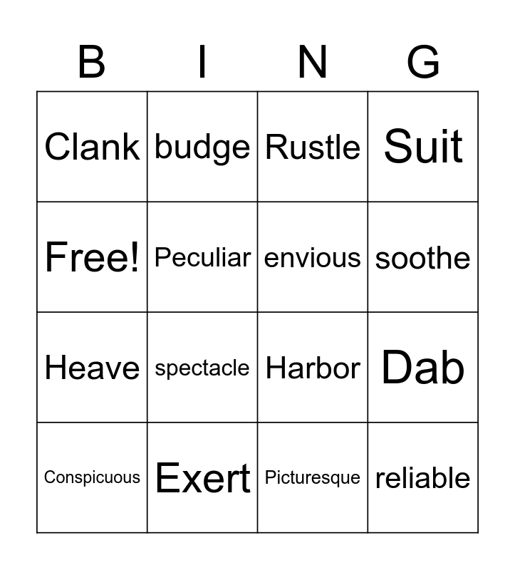 This bingo card has 16 words: Exert, Dab, Rustle, Clank, Heave, budge, Harbor, Picturesque, Free!, Peculiar, Conspicuous, Suit, spectacle, soothe, envious and reliable.