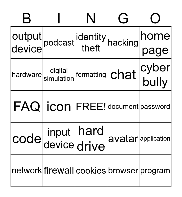 This bingo card has a free space and 24 words: input device, firewall, formatting, network, home page, output device, hardware, podcast, document, hard drive, chat, FAQ, avatar, application, digital simulation, browser, password, identity theft, cyber bully, icon, program, code, hacking and cookies.