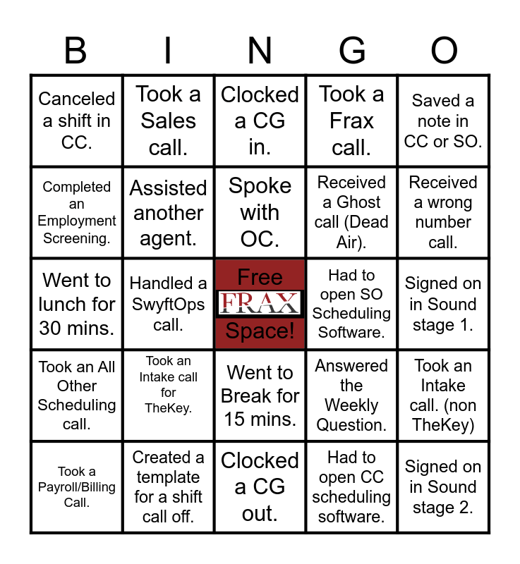 This bingo card has a free space and 24 words: Took an Intake call for TheKey., Created a template for a shift call off., Spoke with OC., Took a Payroll/Billing Call., Saved a note in CC or SO., Canceled a shift in CC., Completed an Employment Screening., Took a Sales call., Had to open SO Scheduling Software., Went to Break for 15 mins., Received a Ghost call (Dead Air)., Went to lunch for 30 mins., Answered the Weekly Question., Took an Intake call. (non TheKey), Assisted another agent., Had to open CC scheduling software., Signed on in Sound stage 1., Clocked a CG in., Received a wrong number call., Handled a SwyftOps call., Signed on in Sound stage 2., Took an All Other Scheduling call., Took a Frax call. and Clocked a CG out..