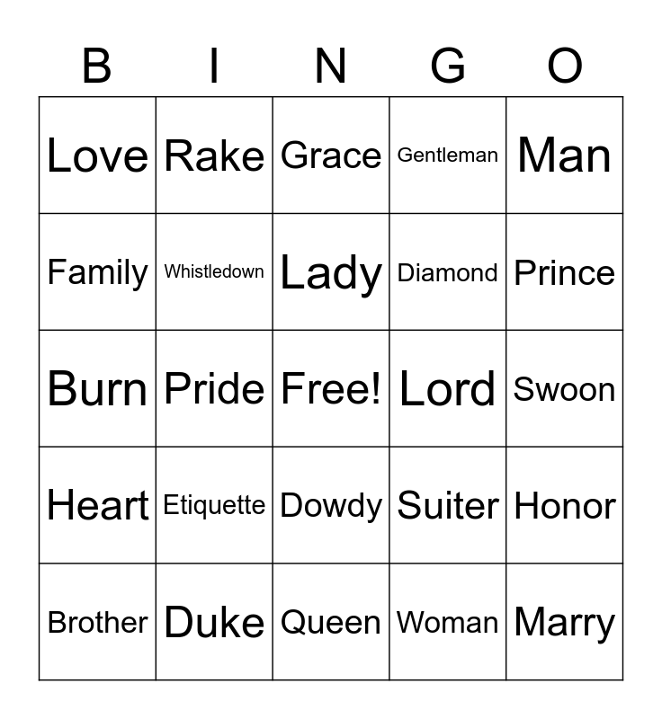This bingo card has a free space and 24 words: Etiquette, Duke, Lady, Brother, Man, Love, Family, Rake, Lord, Dowdy, Diamond, Burn, Suiter, Honor, Whistledown, Woman, Swoon, Grace, Prince, Pride, Marry, Heart, Gentleman and Queen.