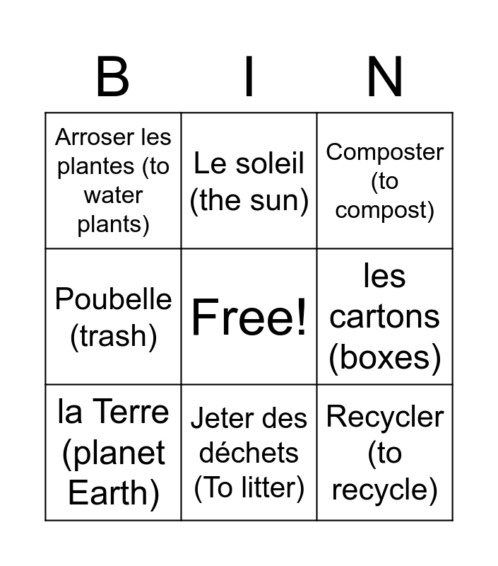 This bingo card has a free space and 10 words: Jeter des déchets (To litter), Composter (to compost), Arroser les plantes (to water plants), Recycler (to recycle), Poubelle (trash), la Terre (planet Earth), Le soleil (the sun), biodégradable, les cartons (boxes) and La pollution (pollution).