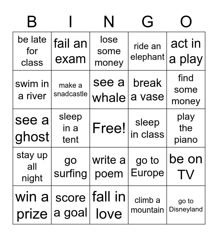 This bingo card has a free space and 24 words: go surfing, score a goal, see a whale, win a prize, act in a play, be late for class, swim in a river, fail an exam, sleep in class, write a poem, break a vase, see a ghost, go to Europe, be on TV, make a snadcastle, climb a mountain, play the piano, lose some money, find some money, sleep in a tent, go to Disneyland, stay up all night, ride an elephant and fall in love.