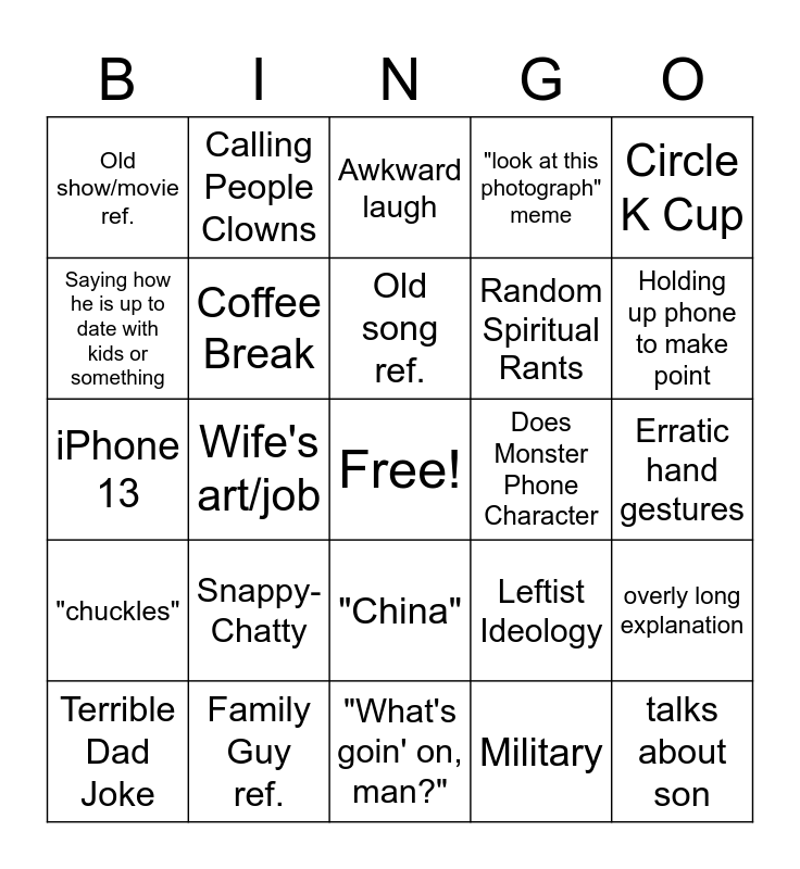 This bingo card has a free space and 24 words: Snappy-Chatty, Family Guy ref., Old song ref., Terrible Dad Joke, Circle K Cup, Old show/movie ref., Saying how he is up to date with kids or something, Calling People Clowns, Does Monster Phone Character, "China", Random Spiritual Rants, iPhone 13, Leftist Ideology, overly long explanation, Coffee Break, Military, Erratic hand gestures, Awkward laugh, Holding up phone to make point, Wife's art/job, talks about son, "chuckles", "look at this photograph" meme and "What's goin' on, man?".