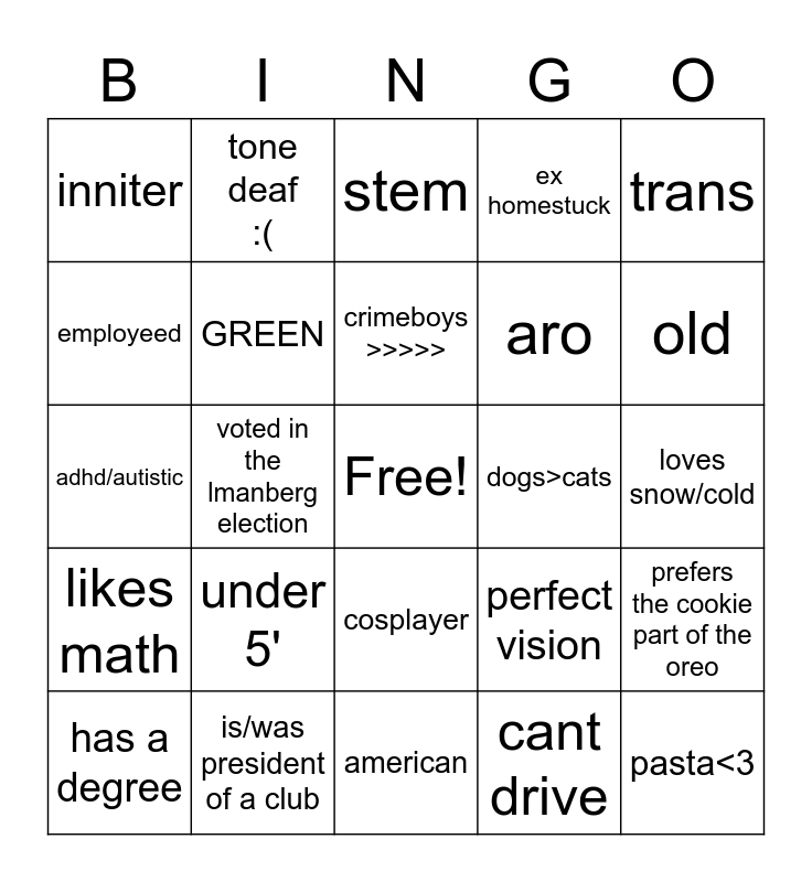 This bingo card has a free space and 24 words: under 5', is/was president of a club, crimeboys >>>>>, has a degree, trans, inniter, employeed, tone deaf :(, dogs>cats, cosplayer, aro, adhd/autistic, perfect vision, prefers the cookie part of the oreo, GREEN, cant drive, loves snow/cold, stem, old, voted in the lmanberg election, pasta<3, likes math, ex homestuck and american.
