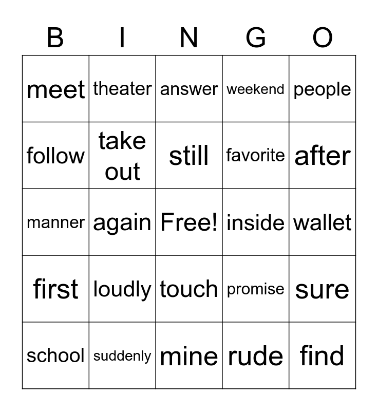 This bingo card has a free space and 29 words: school, excited, again, introduce, meet, answer, take out, loudly, inside, suddenly, wallet, find, mine, rude, after, before, touch, first, people, manner, promise, boring, favorite, follow, weekend, theater, sure, still and late.