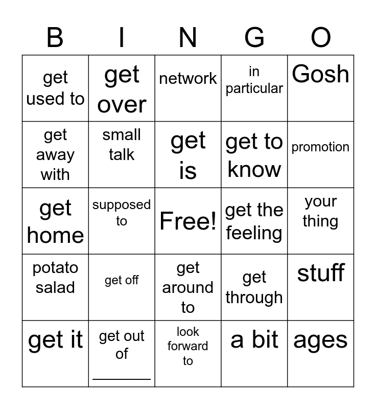 This bingo card has a free space and 24 words: get off, get out of _______, get is, get it, Gosh, get used to, get away with, get over, get the feeling, get around to, get to know, get home, get through, stuff, small talk, a bit, your thing, network, promotion, supposed to, ages, potato salad, in particular and look forward to.
