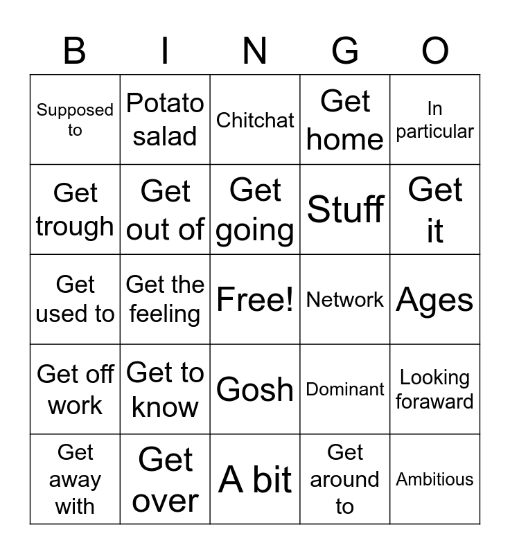 This bingo card has a free space and 24 words: Get to know, Get over, Get going, Get away with, In particular, Supposed to, Get trough, Potato salad, Network, Gosh, Stuff, Get used to, Dominant, Looking foraward, Get out of, Get around to, Ages, Chitchat, Get it, Get the feeling, Ambitious, Get off work, Get home and A bit.