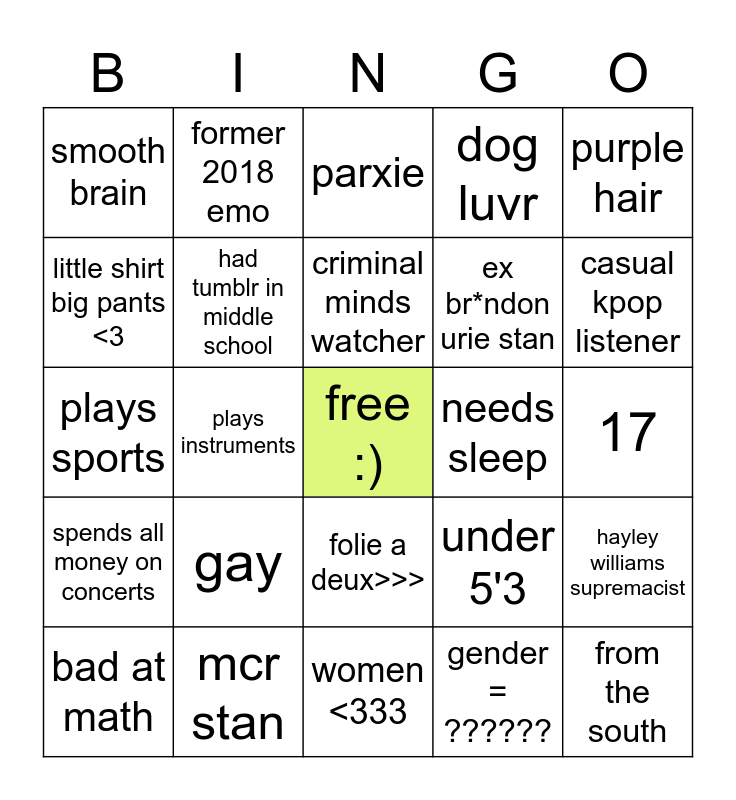 This bingo card has a free space and 24 words: gay, mcr stan, criminal minds watcher, bad at math, purple hair, smooth brain, little shirt big pants <3, former 2018 emo, needs sleep, folie a deux>>>, ex br*ndon urie stan, plays sports, under 5'3, hayley williams supremacist, had tumblr in middle school, gender = ??????, 17, parxie, casual kpop listener, plays instruments, from the south, spends all money on concerts, dog luvr and women <333.