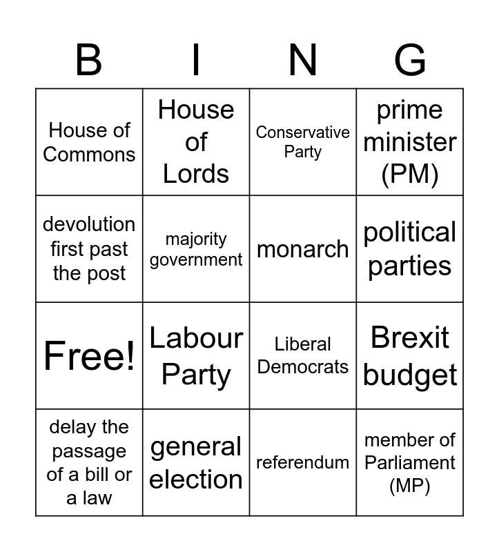 This bingo card has 20 words: Brexit budget, Cabinet minister, Conservative Party, constituency, delay the passage of a bill or a law, devolution first past the post, general election, House of Commons, Free!, House of Lords, Labour Party, Liberal Democrats, majority government, member of Parliament (MP), monarch, pass laws, political parties, prime minister (PM), referendum and transfer of power.