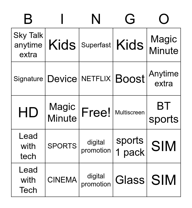 This bingo card has a free space and 24 words: SPORTS, CINEMA, NETFLIX, Lead with Tech, Magic Minute, Sky Talk anytime extra, Signature, Kids, Multiscreen, digital promotion, Boost, HD, sports 1 pack, SIM, Device, Glass, BT sports, Superfast, Anytime extra, Magic Minute, SIM, Lead with tech, Kids and digital promotion.
