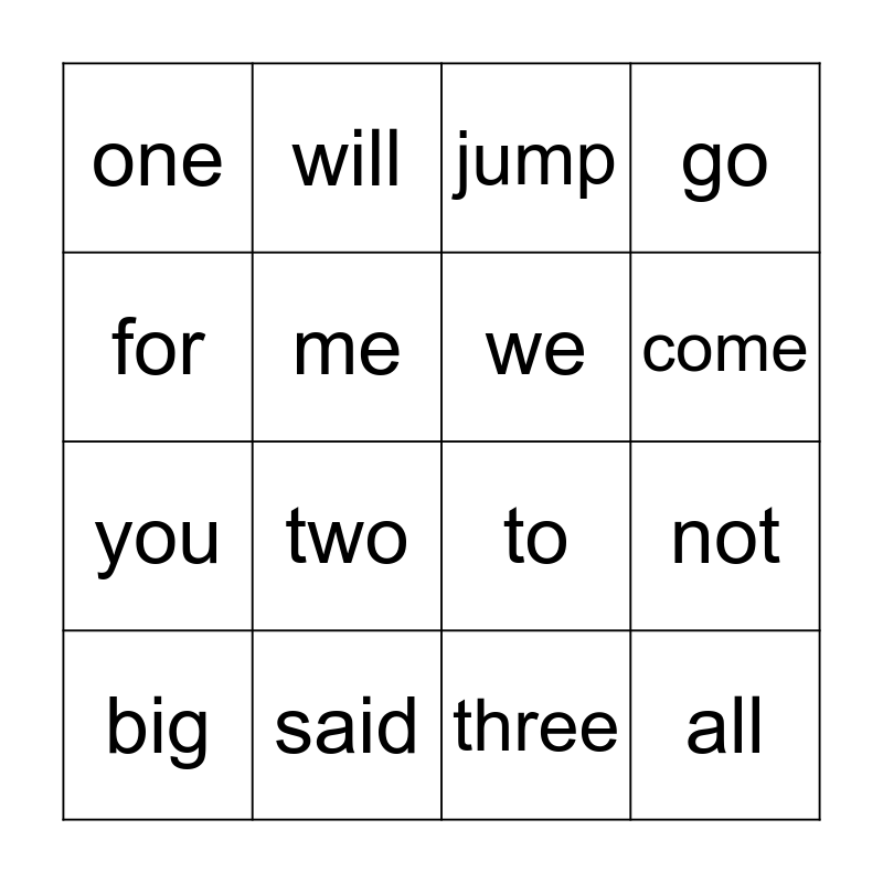 This bingo card has 16 words: said, not, jump, one, you, will, to, three, for, me, big, go, two, come, we and all.