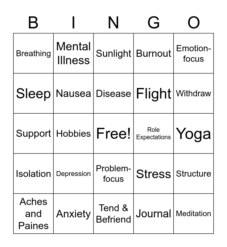This bingo card has a free space and 27 words: Stress, Fight, Flight, Tend & Befriend, Sleep, Sunlight, Mental Illness, Isolation, Role Expectations, Structure, Support, Burnout, Aches and Paines, Anxiety, Withdraw, Diet, Nausea, Disease, Depression, Breathing, Yoga, Journal, Hobbies, Meditation, Problem-focus, Emotion-focus and Relationships.
