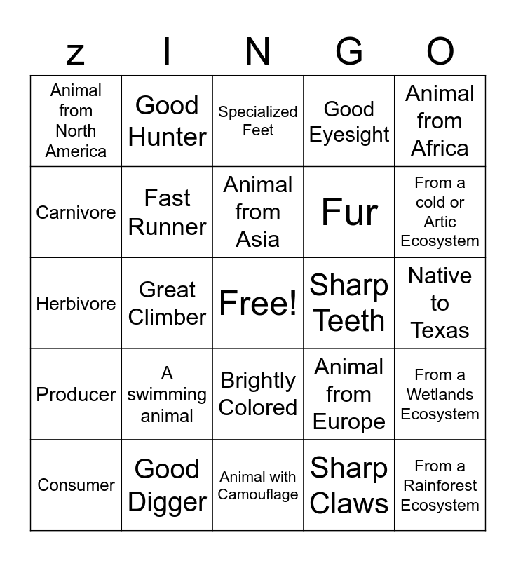 This bingo card has a free space and 34 words: Omnivore, Great Swimmer, Venomous Animal, Scales, Native to Texas, Carnivore, Fast Runner, Animal with Camouflage, Fur, From a Rainforest Ecosystem, Herbivore, Good Hunter, Sharp Claws, From a Desert Ecosystem, Producer, Great Climber, Brightly Colored, Sharp Teeth, From a Wetlands Ecosystem, Consumer, Good Digger, An Unusual Feature, Good Eyesight, From a cold or Artic Ecosystem, An animal eating food, A swimming animal, Specialized Feet, Animal featured in a movie, Animal from Africa, Animal from North America, Animal from South America, Animal from Asia, Animal from Europe and Animal from Australia.