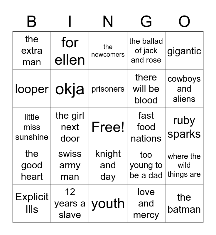This bingo card has a free space and 24 words: swiss army man, 12 years a slave, prisoners, Explicit Ills, gigantic, the extra man, looper, for ellen, fast food nations, knight and day, there will be blood, little miss sunshine, too young to be a dad, where the wild things are, okja, love and mercy, ruby sparks, the newcomers, cowboys and aliens, the girl next door, the batman, the good heart, the ballad of jack and rose and youth.