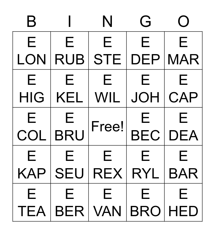 This bingo card has a free space and 25 words: E SEU, E VAN, E WIL, E TEA, E MAR, E LON, E HIG, E RUB, E BEC, E REX, E JOH, E COL, E RYL, E BAR, E KEL, E WEL, E DEA, E STE, E CAP, E BRU, E HED, E BER, E KAP, E DEP and E BRO.
