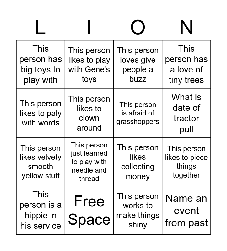 This bingo card has 16 words: Free Space, This person likes to piece things together, This person loves give people a buzz, This person has big toys to play with, This person likes velvety smooth yellow stuff, This person likes to play with Gene's toys, This person likes collecting money, This person works to make things shiny, This person likes to paly with words, This person likes to clown around, This person is a hippie in his service, This person has a love of tiny trees, This person just learned to play with needle and thread, What is date of tractor pull, This person is afraid of grasshoppers and Name an event from past.