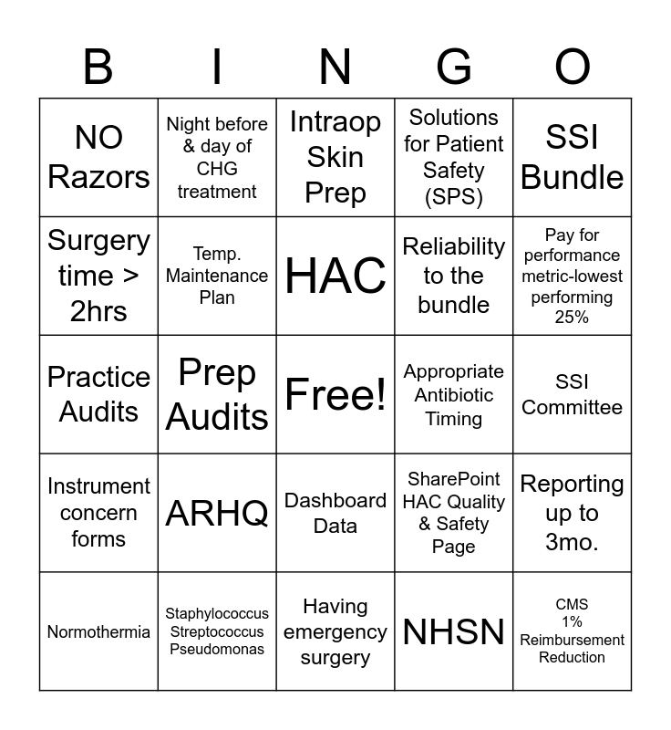 This bingo card has a free space and 24 words: Normothermia, ARHQ, HAC, NHSN, SSI Bundle, NO Razors, Night before & day of CHG treatment, Intraop Skin Prep, Appropriate Antibiotic Timing, SSI Committee, Practice Audits, Temp. Maintenance Plan, SharePoint HAC Quality & Safety Page, Reporting up to 3mo., Surgery time > 2hrs, Staphylococcus Streptococcus Pseudomonas, Having emergency surgery, Solutions for Patient Safety (SPS), Pay for performance metric-lowest performing 25%, Instrument concern forms, Prep Audits, Dashboard Data, Reliability to the bundle and CMS 1% Reimbursement Reduction.