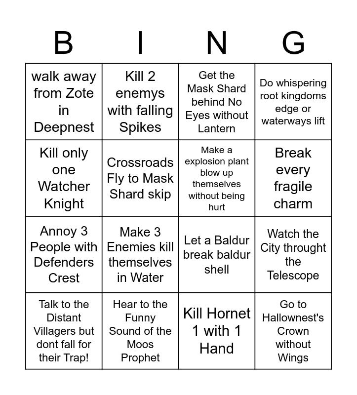 This bingo card has 16 words: Hear to the Funny Sound of the Moos Prophet, Watch the City throught the Telescope, Get the Mask Shard behind No Eyes without Lantern, walk away from Zote in Deepnest, Annoy 3 People with Defenders Crest, Kill 2 enemys with falling Spikes, Let a Baldur break baldur shell, Kill Hornet 1 with 1 Hand, Kill only one Watcher Knight, Crossroads Fly to Mask Shard skip, Talk to the Distant Villagers but dont fall for their Trap!, Do whispering root kingdoms edge or waterways lift, Make 3 Enemies kill themselves in Water, Break every fragile charm, Make a explosion plant blow up themselves without being hurt and Go to Hallownest's Crown without Wings.