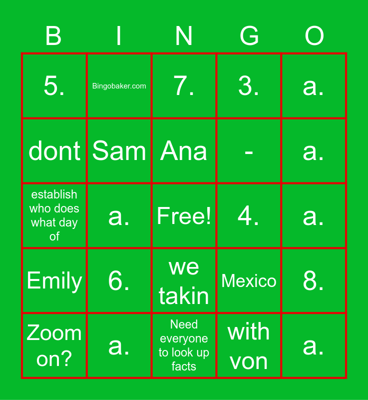This bingo card has a free space and 36 words: Kai, Stacey, Ryan, Sam, Mexico, Emily, Ana, 1., a., 2., a., 3., a., 4., a., 5., a., 6., a., 7., a., 8., a., Zoom on?, Need everyone to look up facts, Bingobaker.com, establish who does what day of, -, -, dont, respond, to it, with von, we takin, they and women.