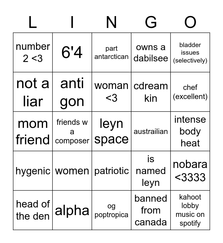 This bingo card has a free space and 24 words: women, alpha, woman <3, head of the den, bladder issues (selectively), number 2 <3, not a liar, 6'4, austrailian, patriotic, cdream kin, mom friend, is named leyn, nobara <3333, anti gon, banned from canada, intense body heat, part antarctican, chef (excellent), friends w a composer, kahoot lobby music on spotify, hygenic, owns a dabilsee and og poptropica.